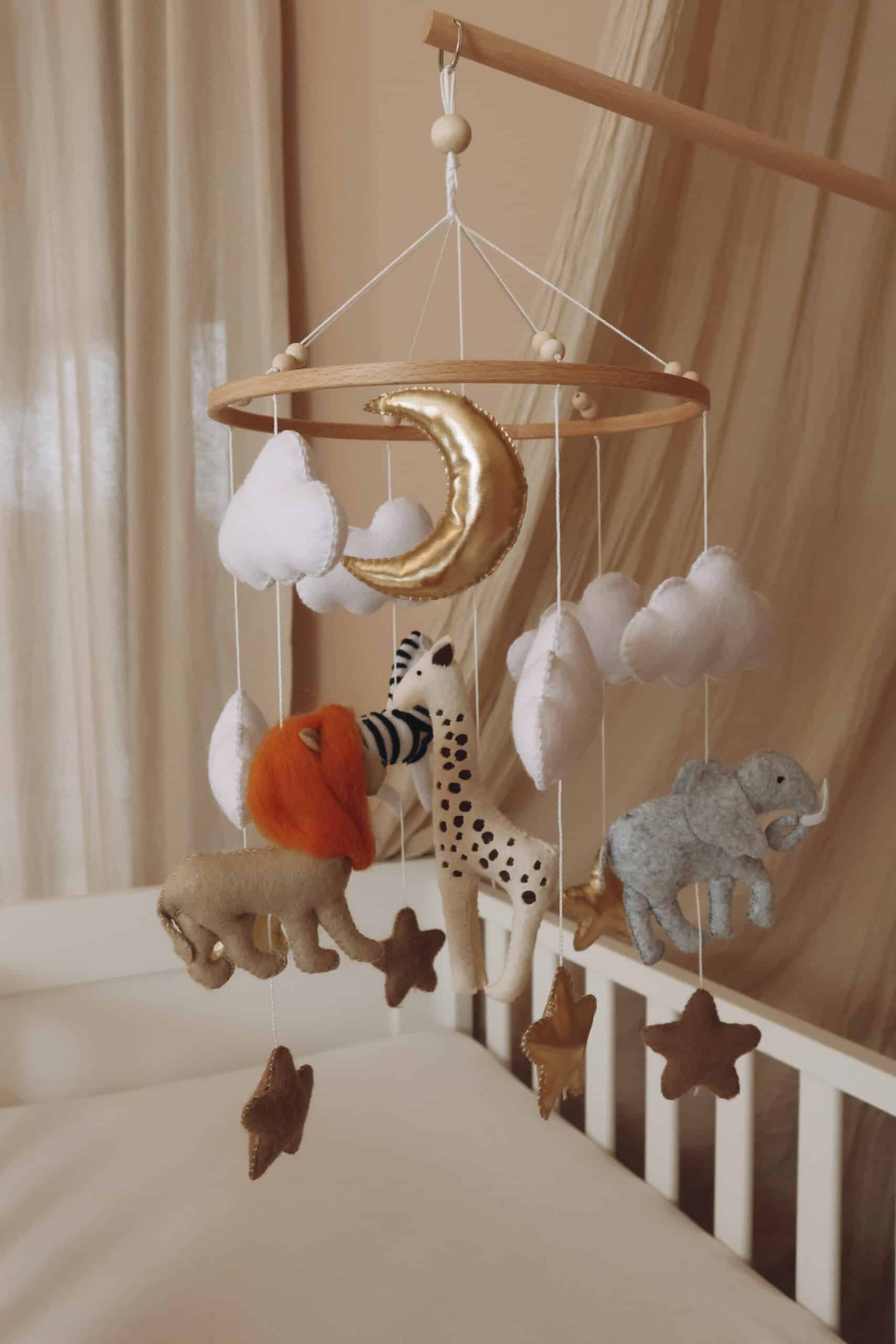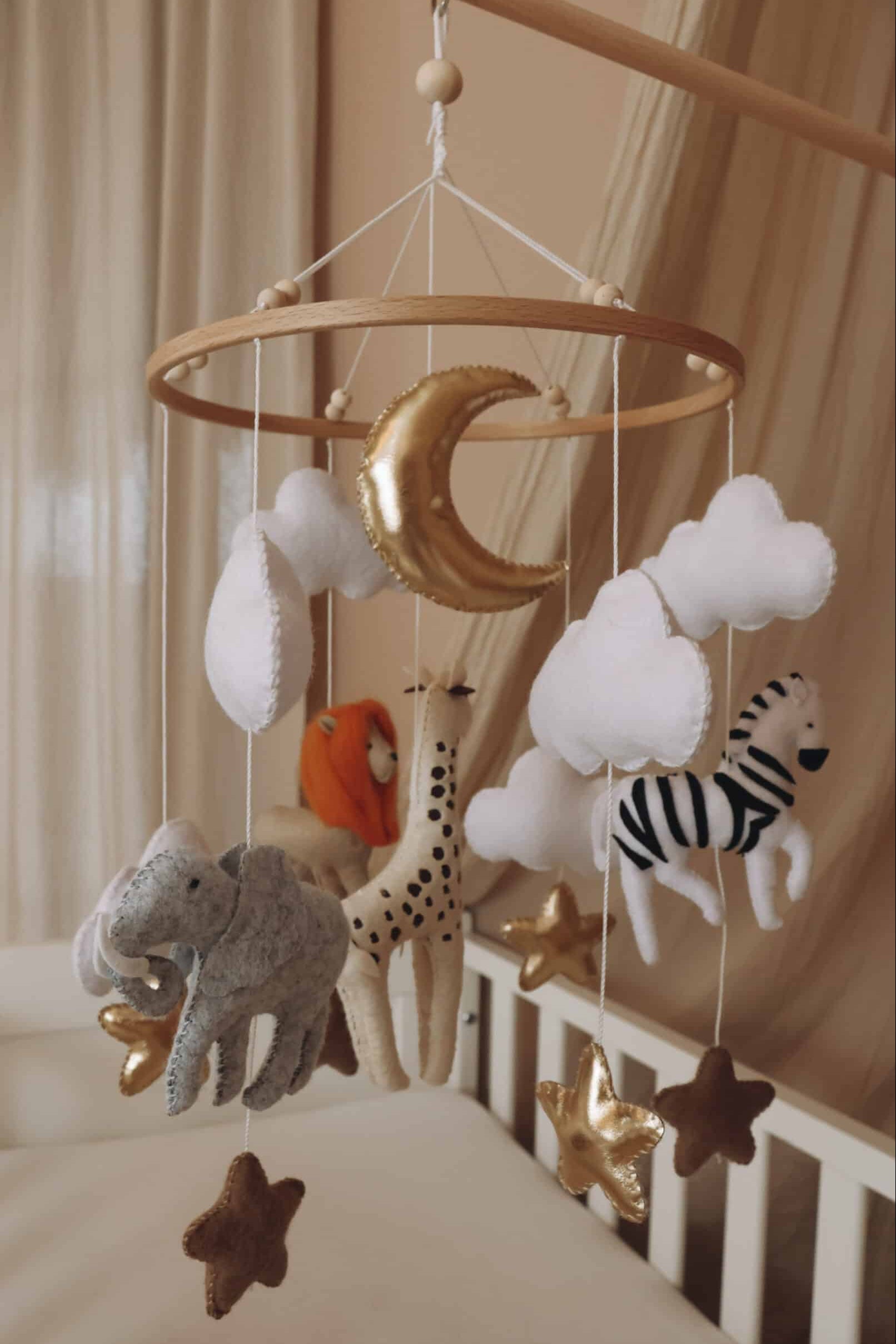 Mobile artesanal em madeira com animais do safari, nuvens e detalhes suaves, pensado para criar um ambiente calmo e acolhedor no quarto do bebé.
